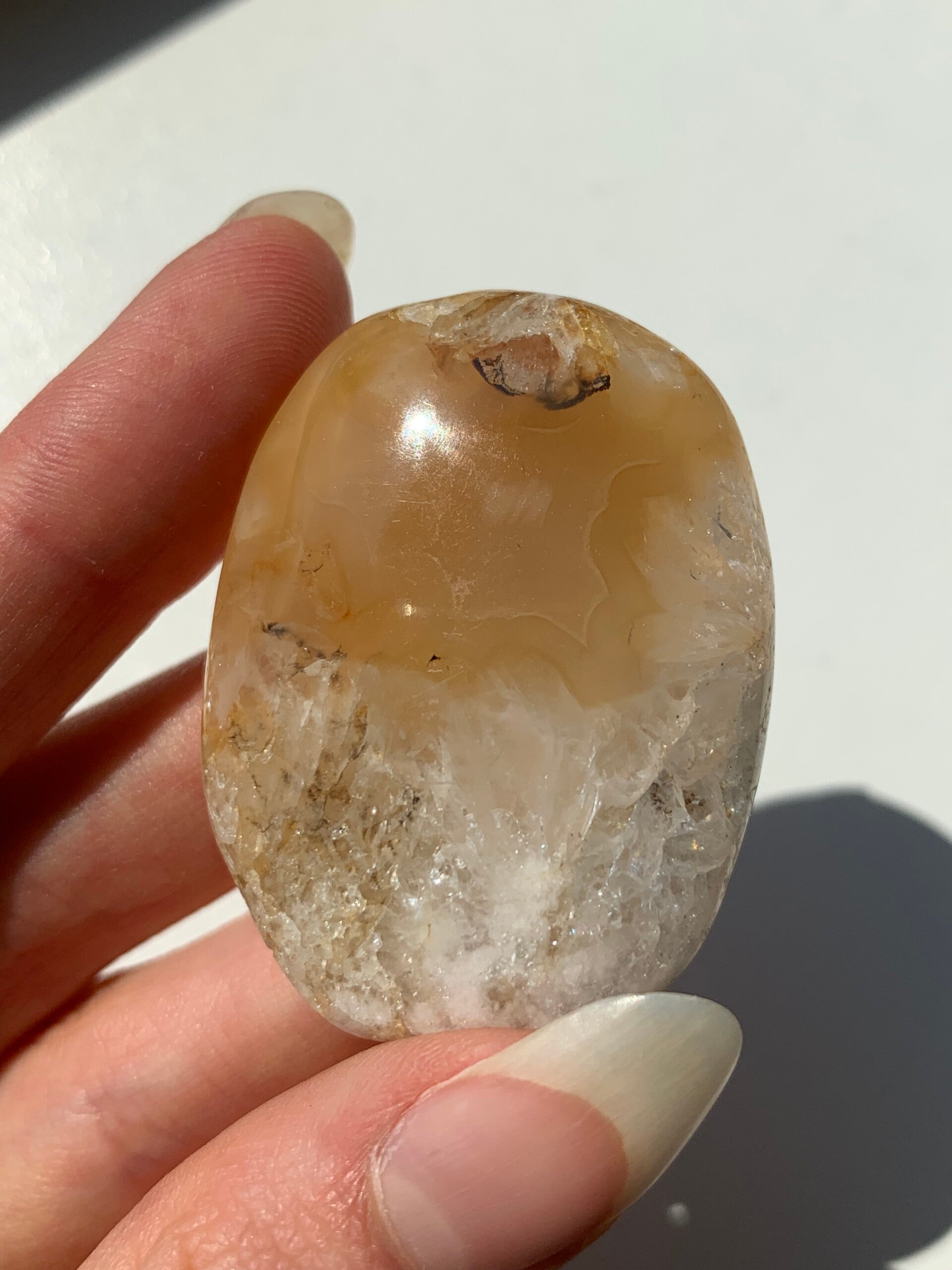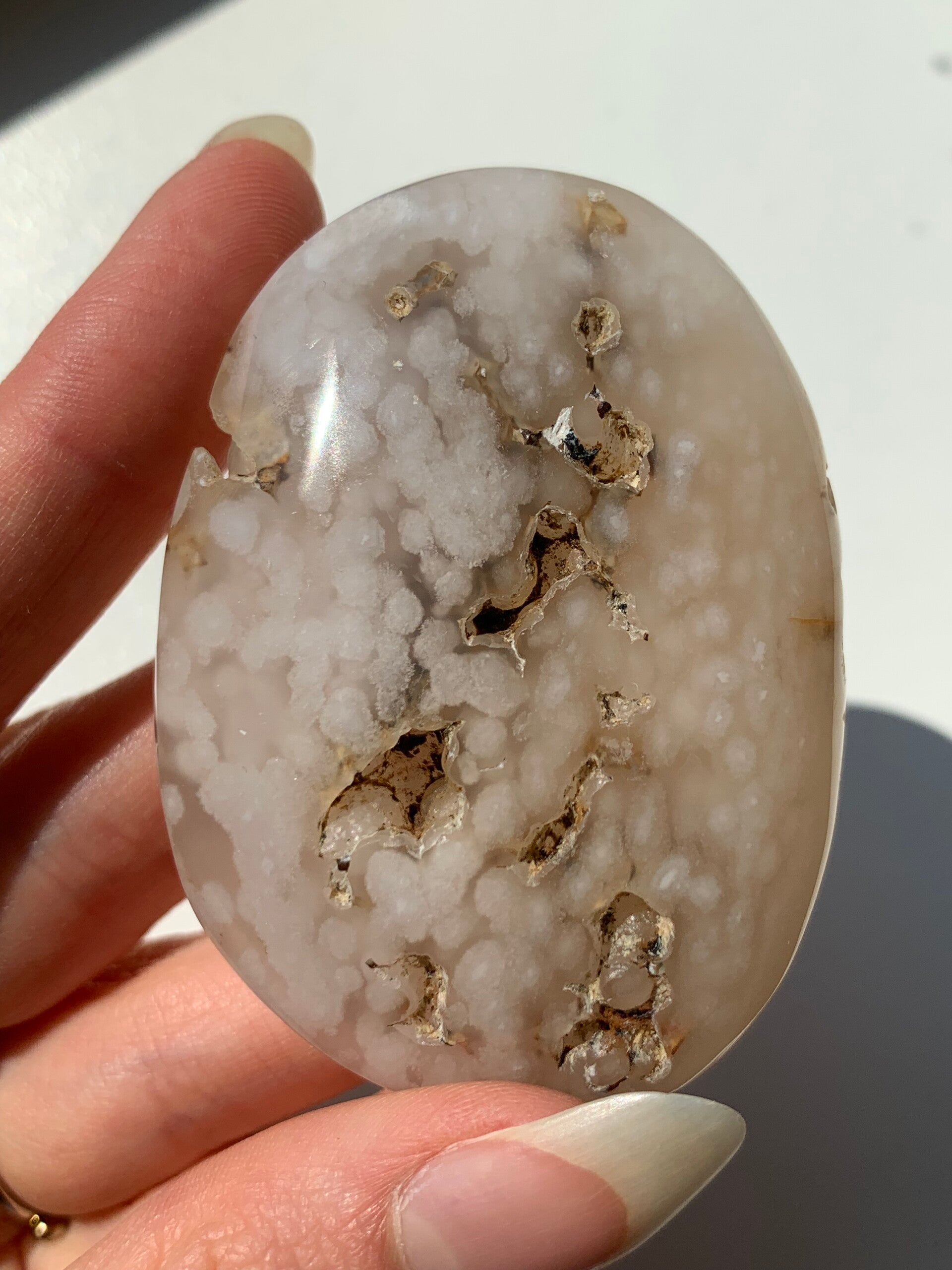 Deze palmstenen van bloemagaat (chalcedoon) hebben prachtige bloemen, zachte kleuren en mooie details. Een enkeling heeft zelfs roze amethist!