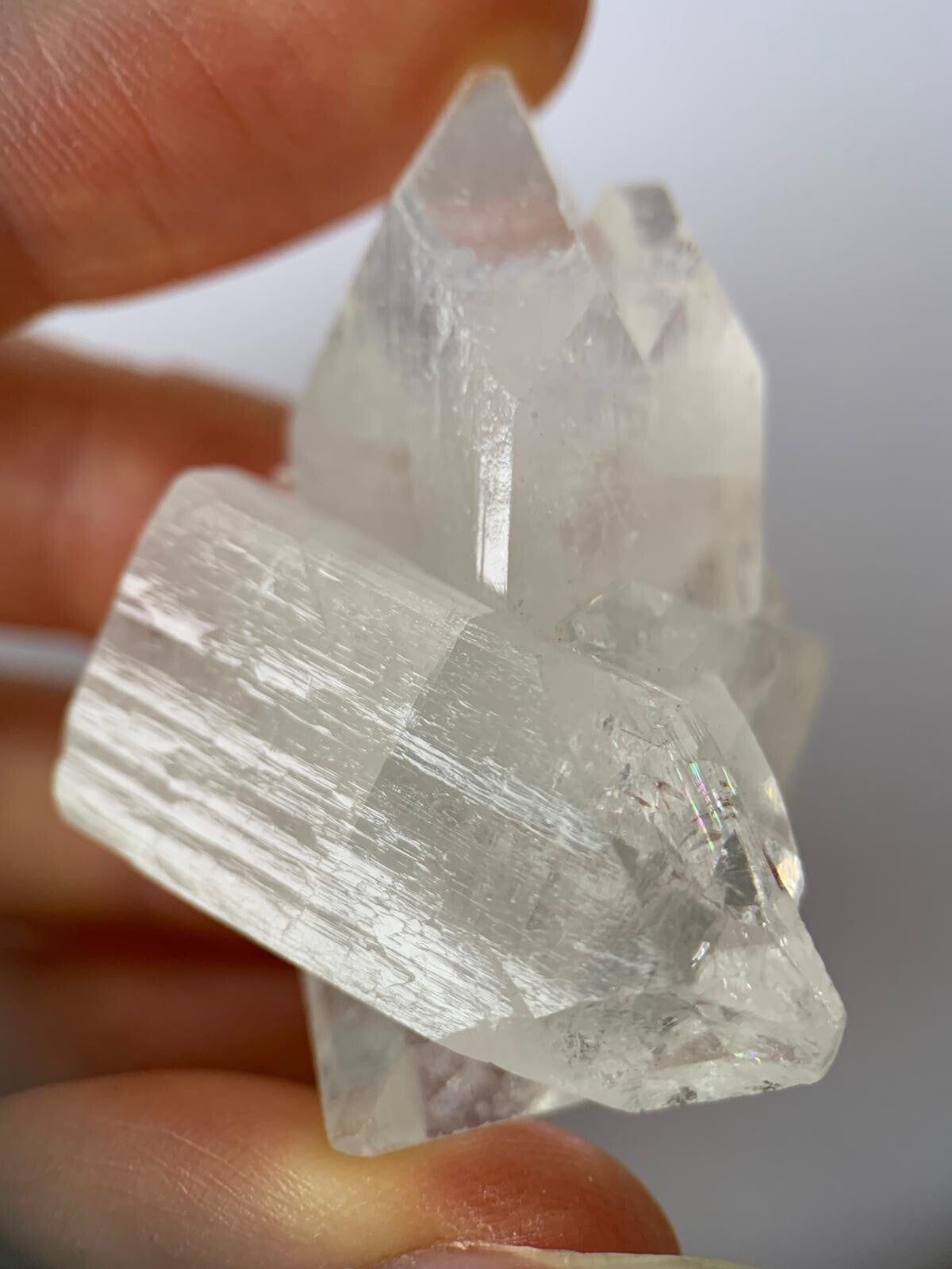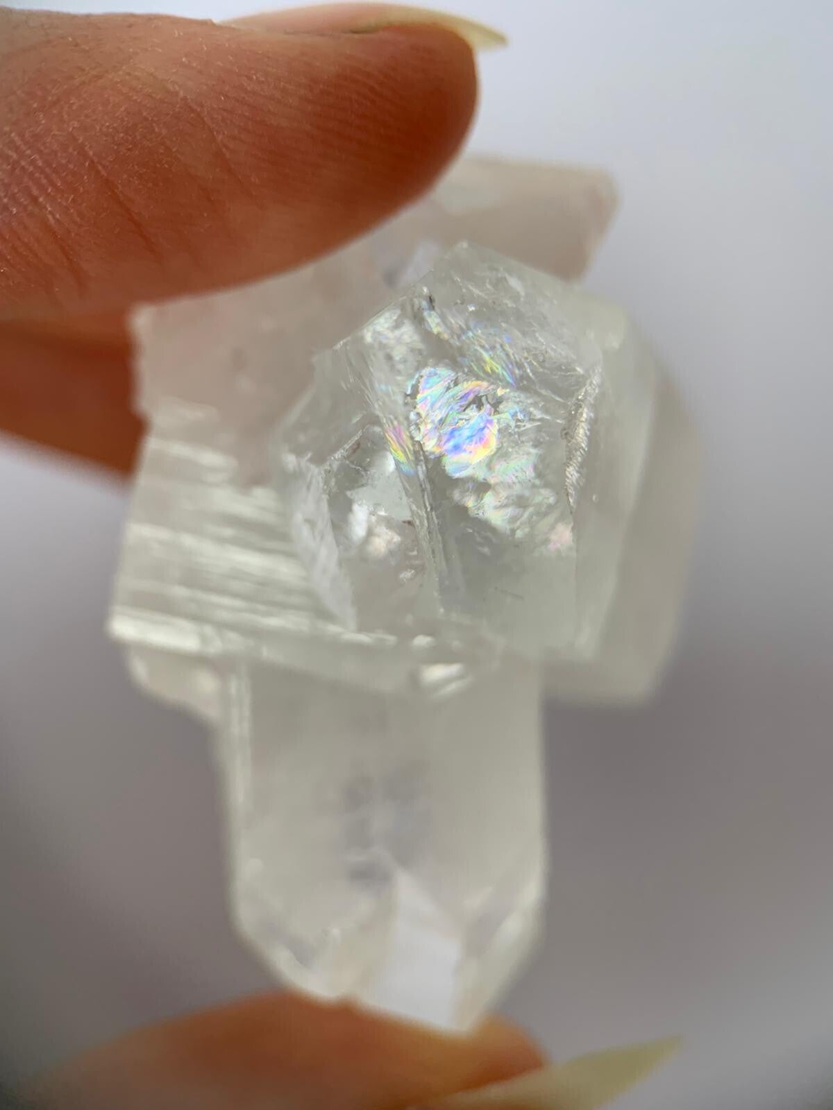 Kleine cluster van 'diamond' apofyliet. Deze is super helder en zit vol glinsteringen en regenboogjes.