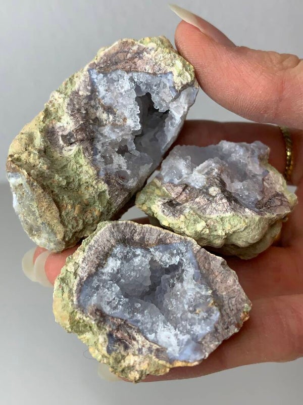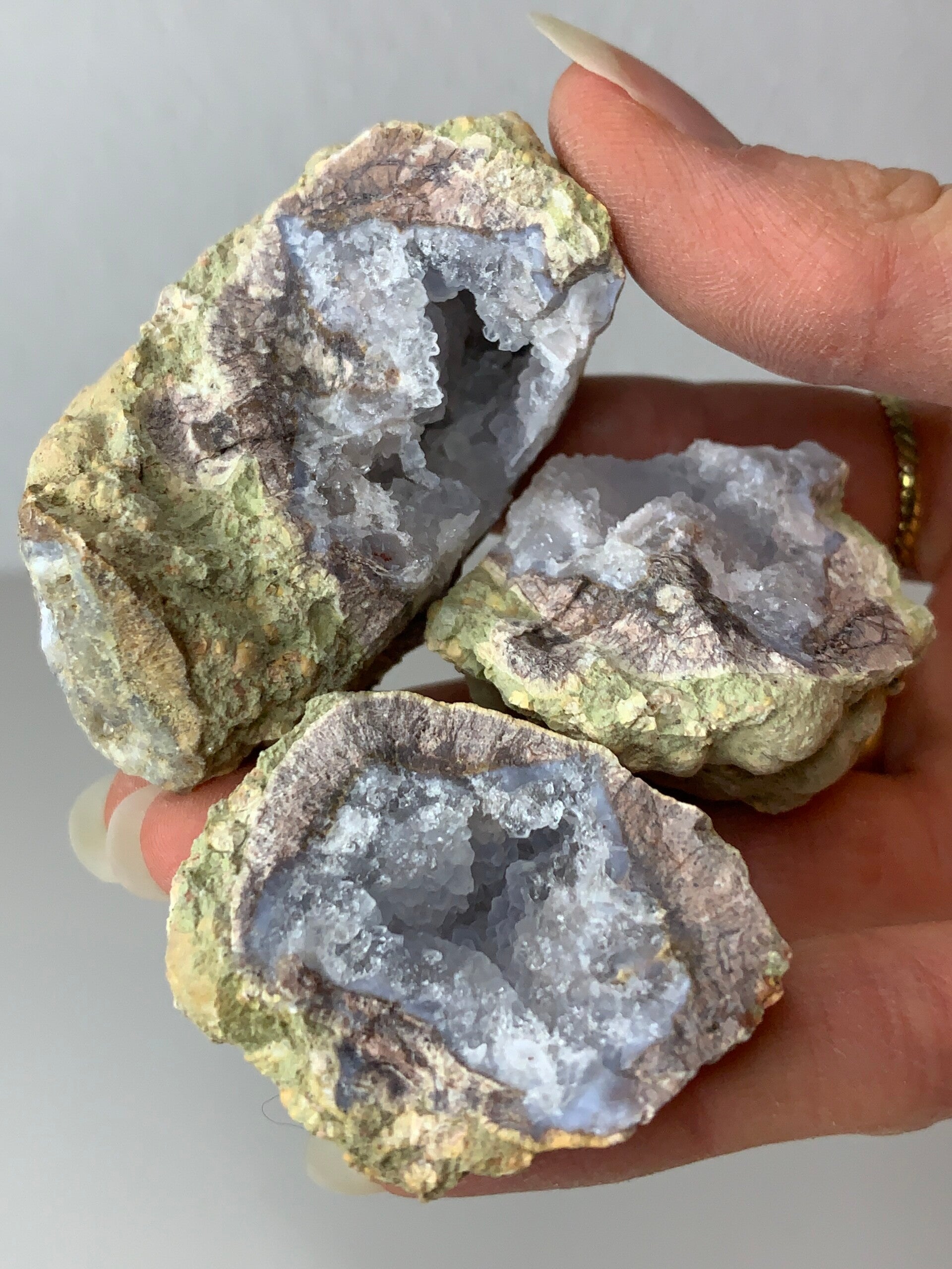 Deze prachtige 'Candy' geodes bevatten voornamelijk chalcedoon. Ze hebben een gelige buitenkant met lichtblauwe kwarts kristallen (en soms rhyoliet of hematiet) binnenin. Deze komen uit Chihuahua, Mexico.