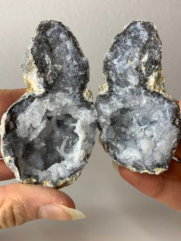 Deze prachtige Trancas geodes bevatten voornamelijk kwarts en chalcedoon. Ze hebben lichtblauwe kwartspuntjes en stukjes glinsterend chalcedoon. Dit zijn aan elkaar gegroeide geodes! Deze komen uit Chihuahua, Mexico.