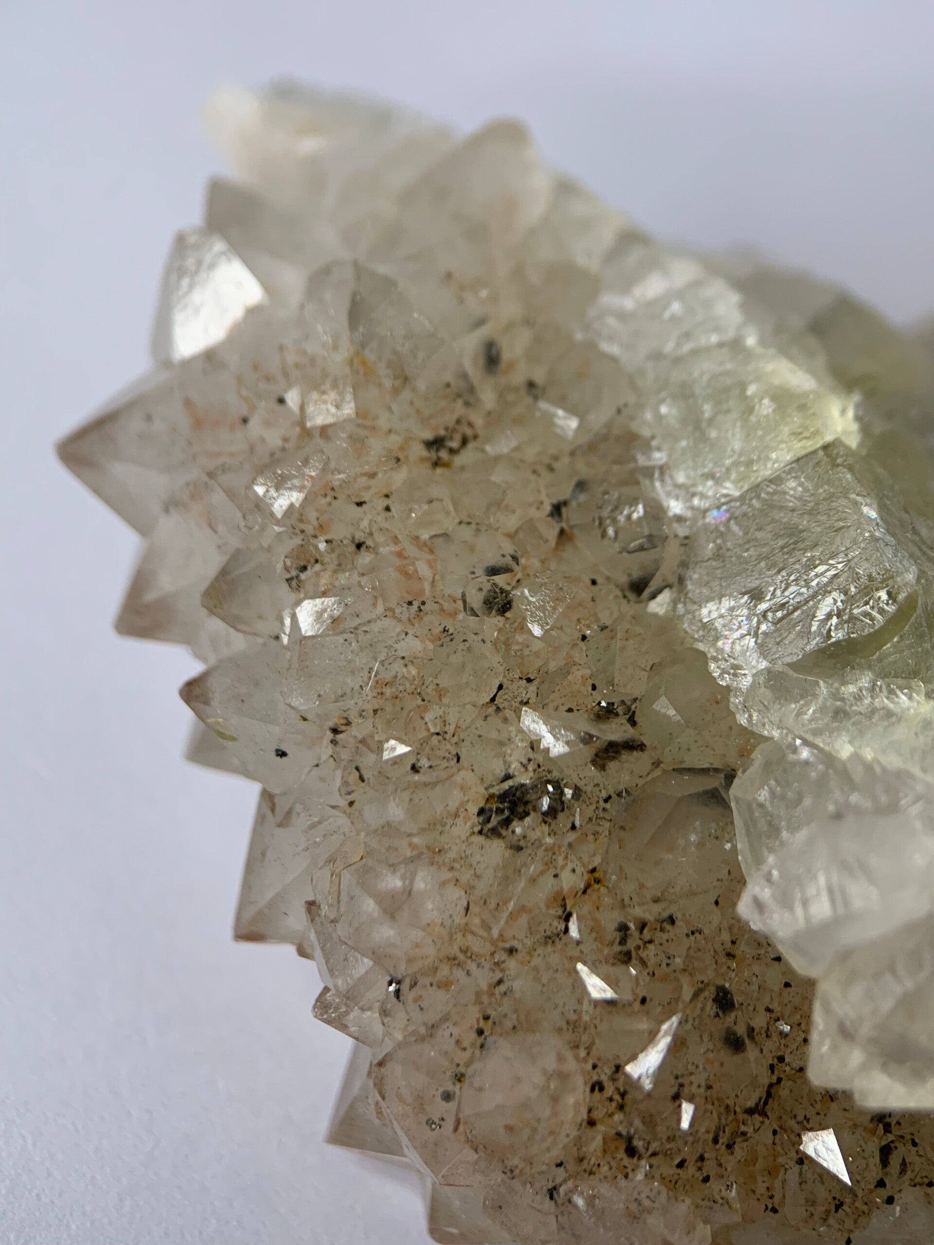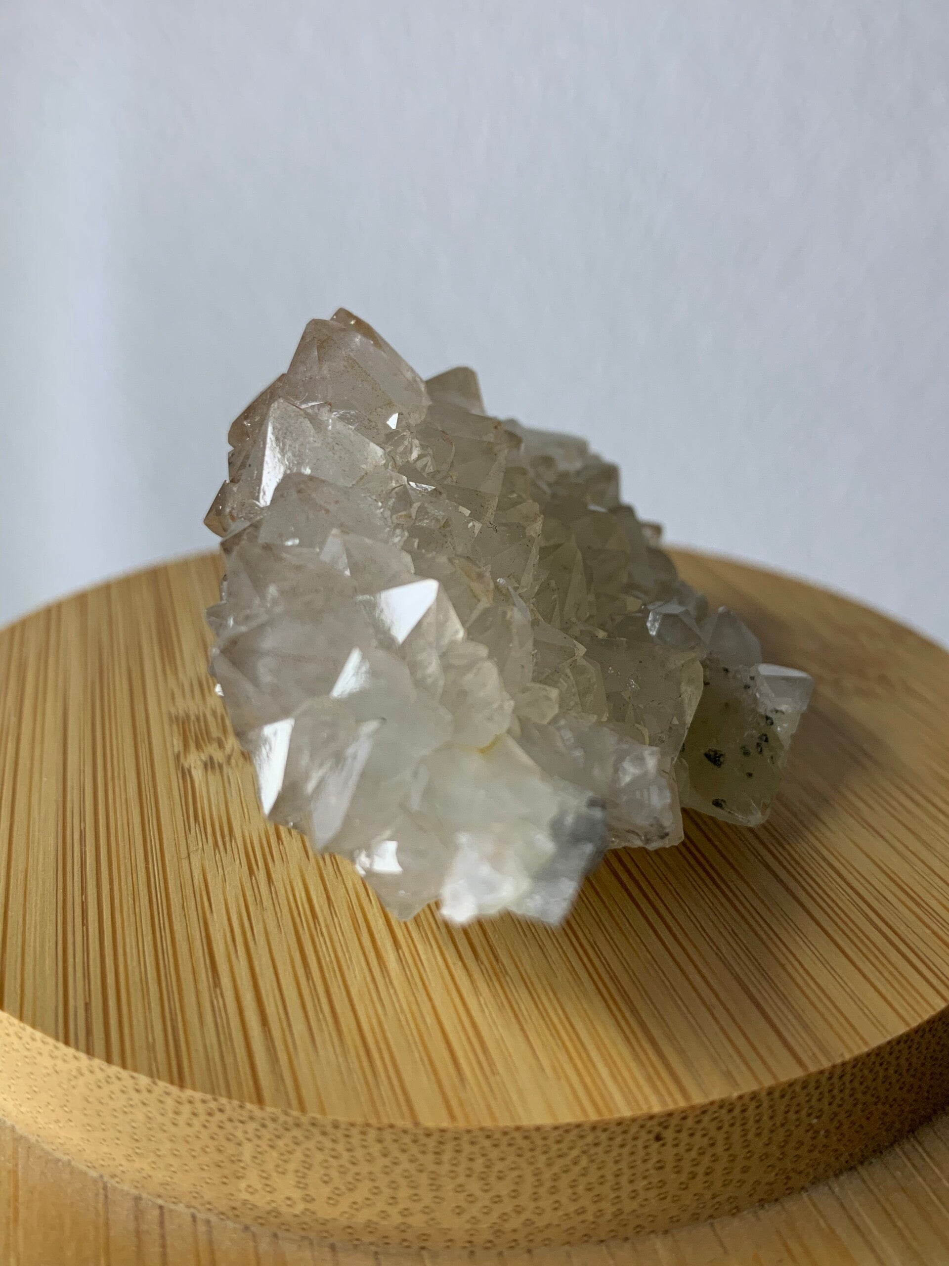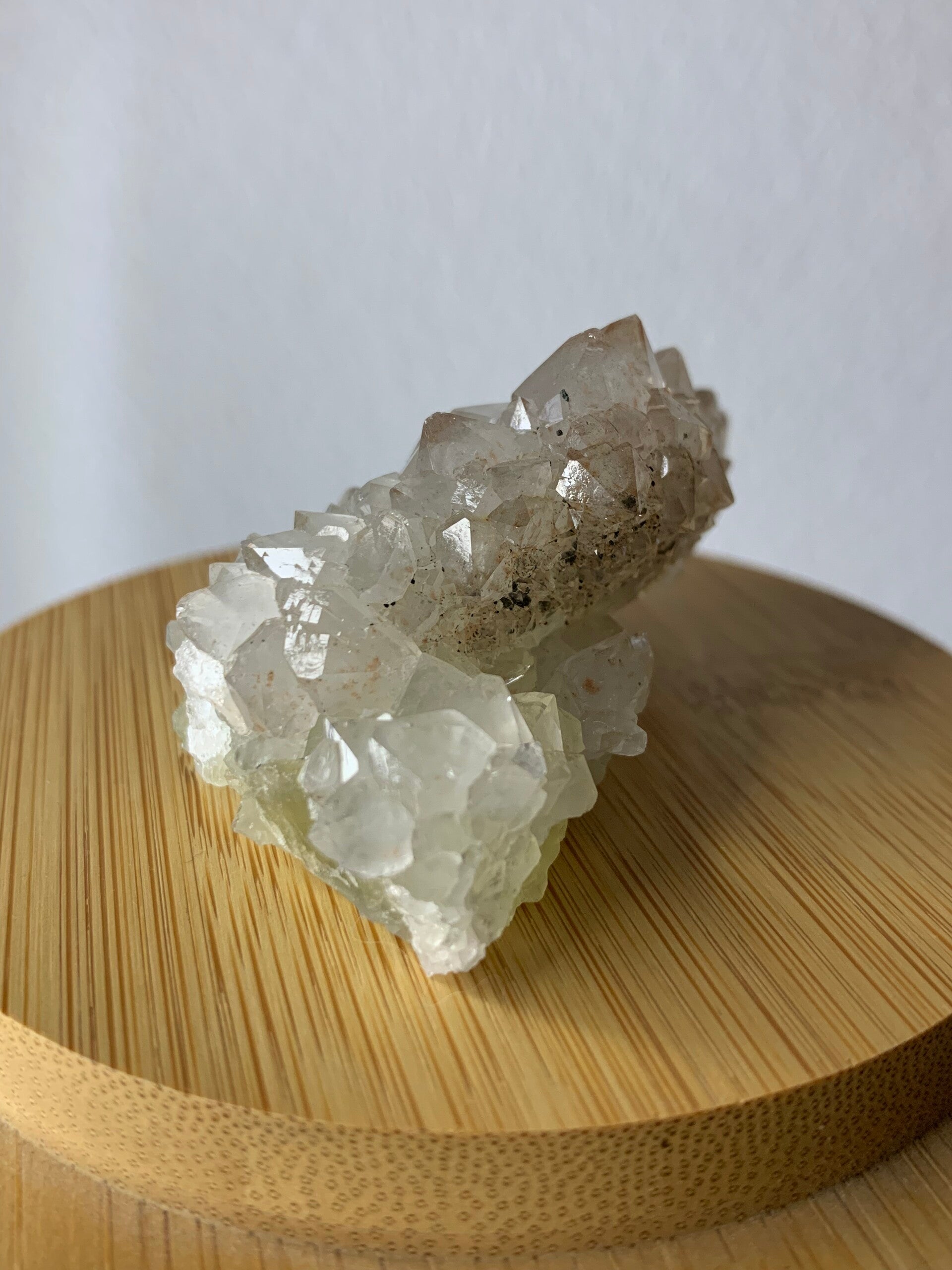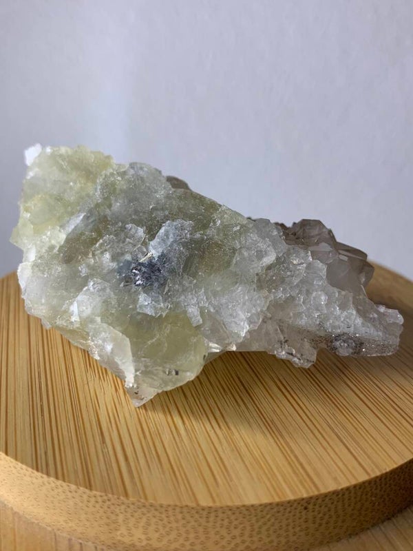 Supermooi stukje van fluoriet met kwarts. Deze bestaat voornamelijk uit kwarts met insluitsels en een bodem van fluoriet. Ze heeft een prachtige glans.