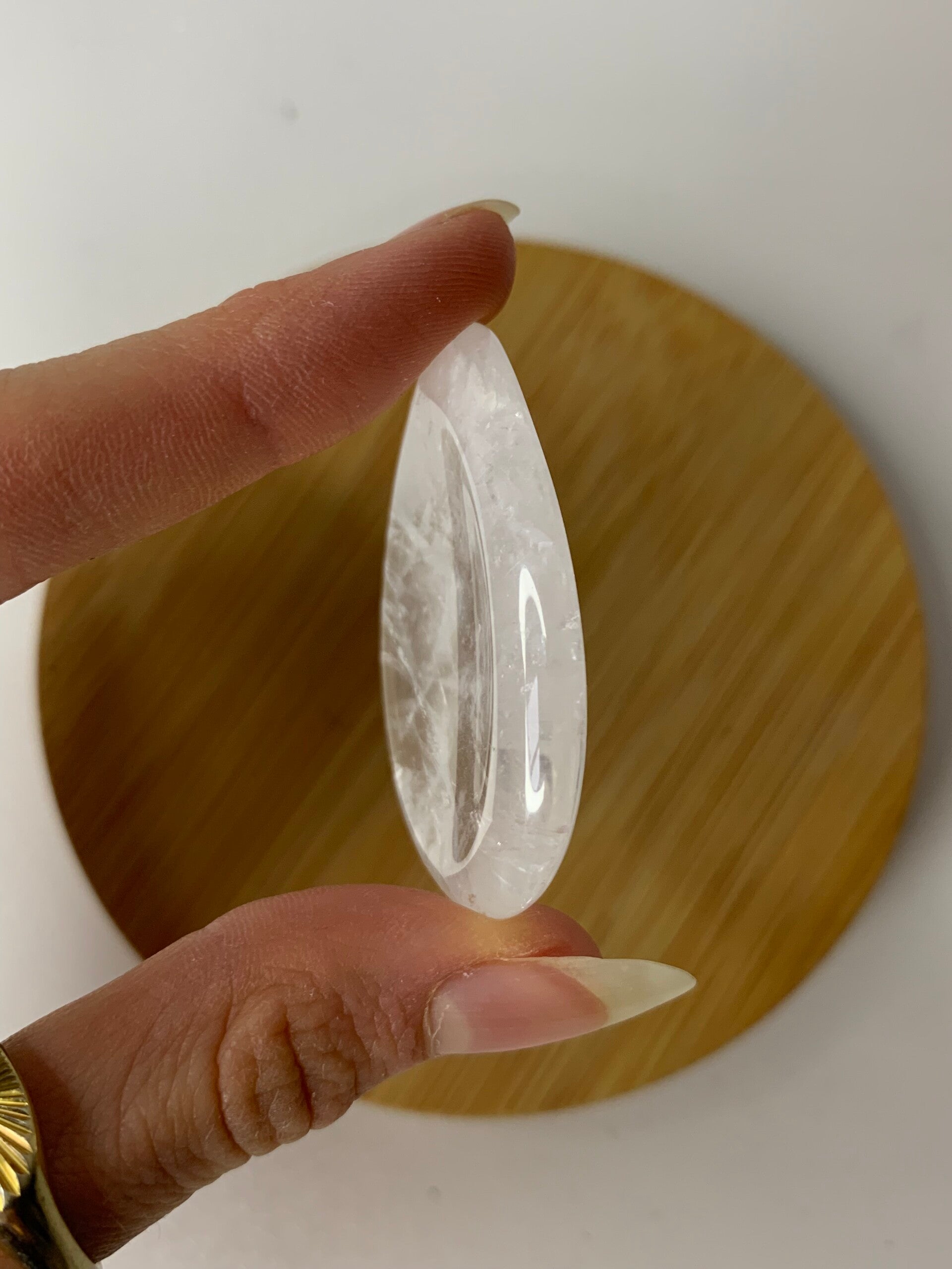 Heldere worrystone van bergkristal. Dit is een glad geslepen amulet, met een duimkuiltje die je gebruikt om te kalmeren en stress te verlichten.