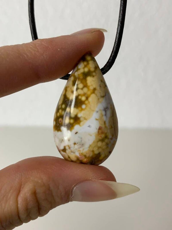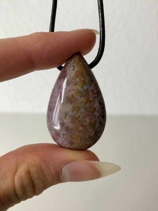 Prachtige doorboorde hanger van oceaan jaspis, in verschillende kleurtinten. Inclusief leren koord met een verstelbare knoop. Je kunt de hanger zelf uitkiezen!