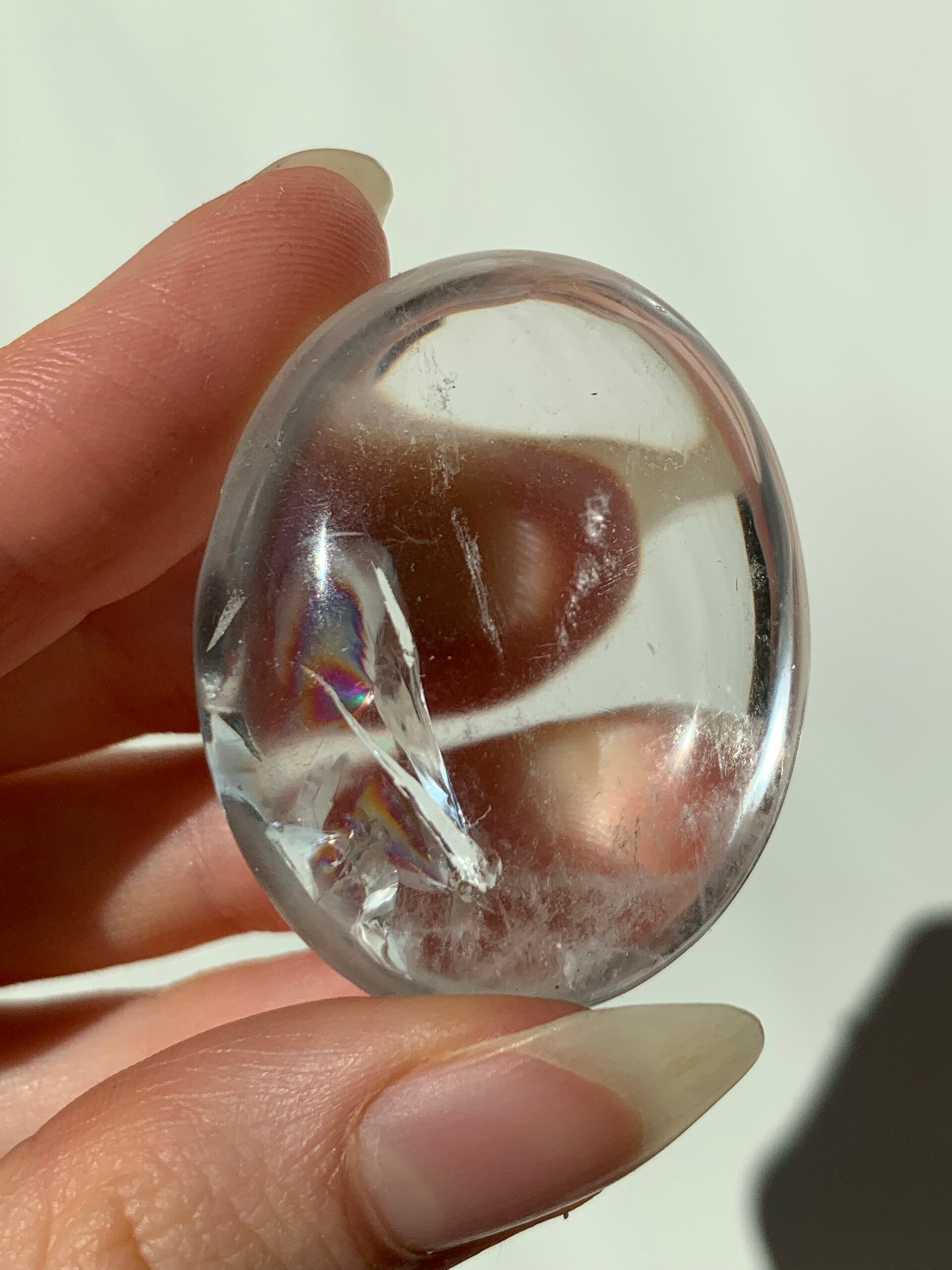 Super heldere trommelstenen van bergkristal. Enkelen hebben zelfs een regenboog! De prijs is per stuk.