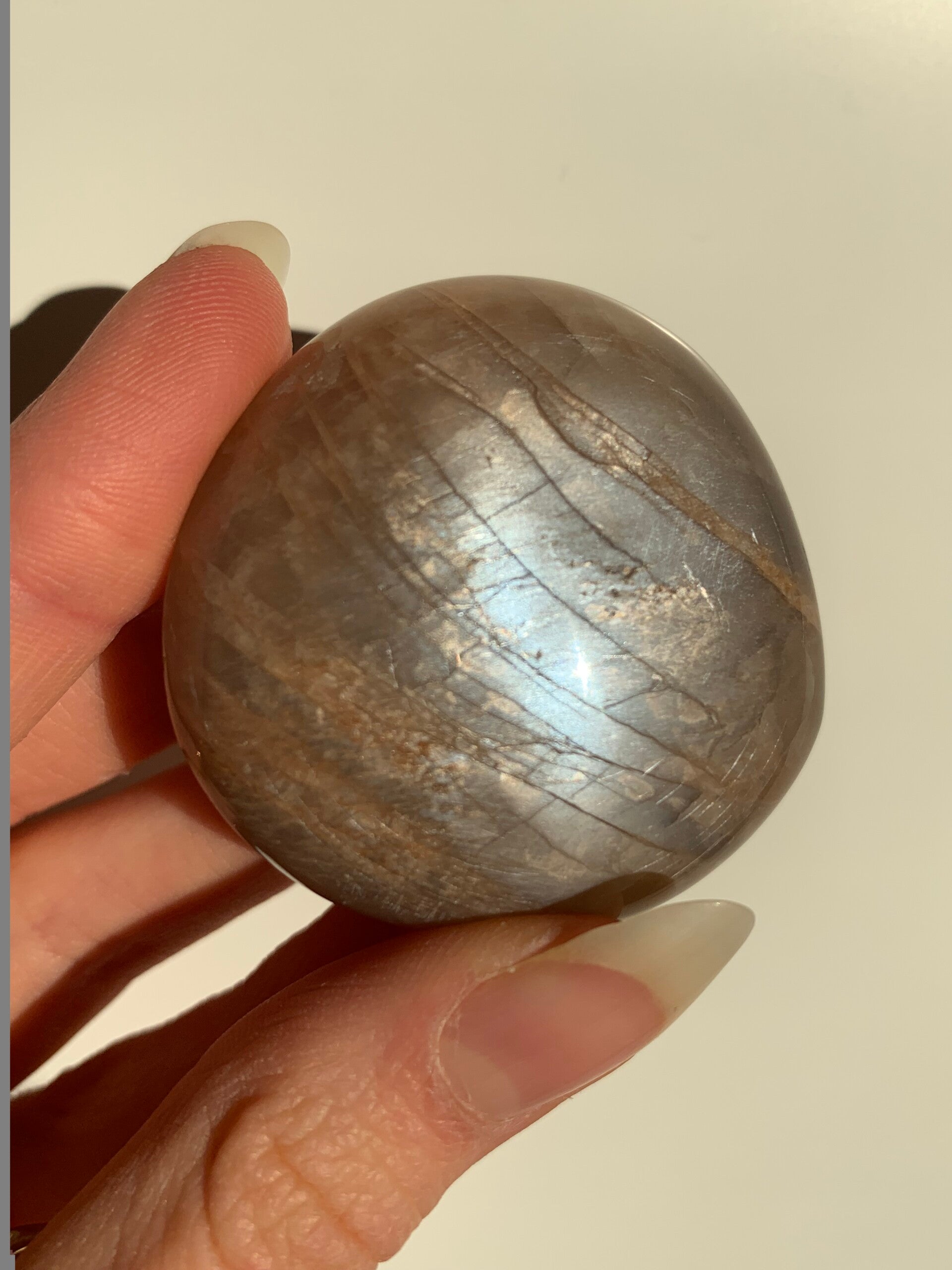 Prachtige roze maansteen-microklien palmsteen met volledige flash aan beide kanten. Vraag gerust om een filmpje, om de flash beter te zien!