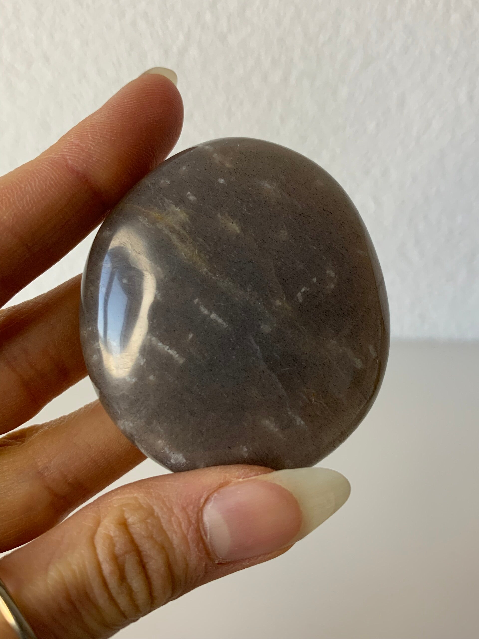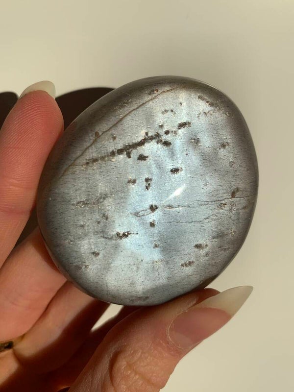 Prachtige grijze maansteen-microklien palmsteen met volledige flash aan beide kanten. Vraag gerust om een filmpje, om de flash beter te zien!