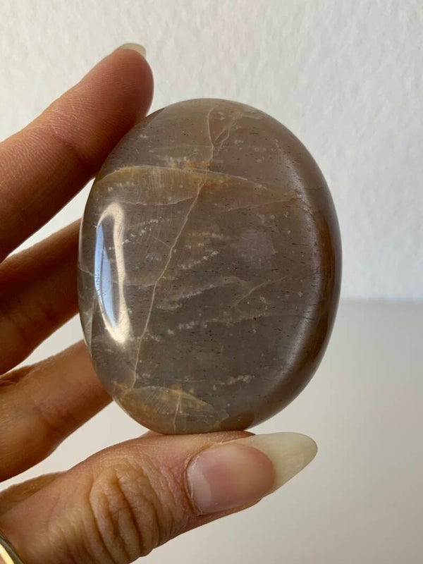 Prachtige bruine maansteen-microklien palmsteen met volledige flash aan beide kanten. Vraag gerust om een filmpje, om de flash beter te zien!