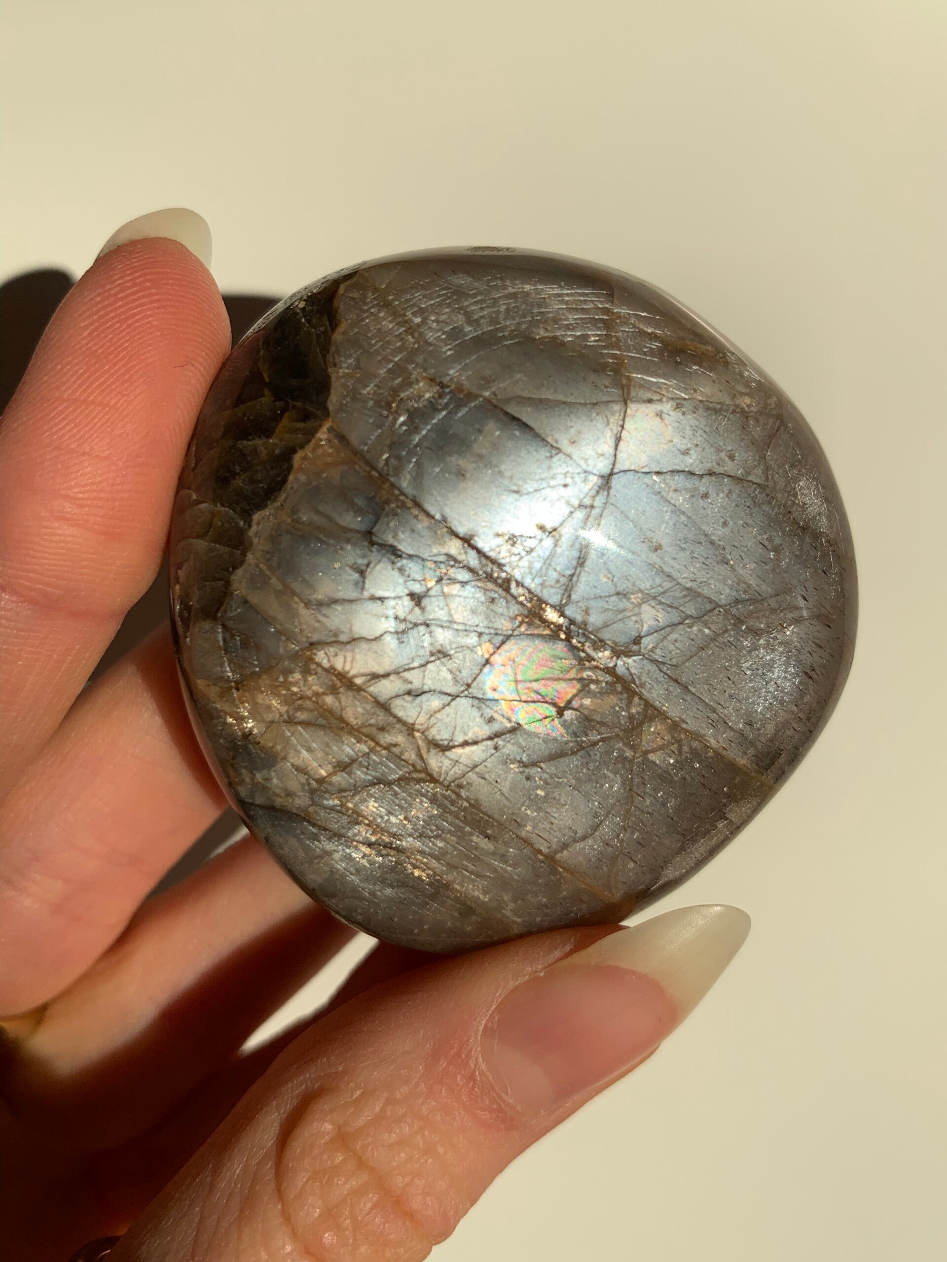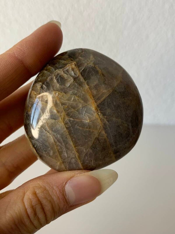 Prachtige bruin/zwarte maansteen-microklien palmsteen met volledige flash aan beide kanten. Vraag gerust om een filmpje, om de flash beter te zien!