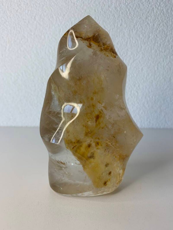 Grote vlam van golden healer in bergkristal. Je kunt goed het onderscheidt tussen de golden healer en kwarts zien en ze zit vol regenboogjes!