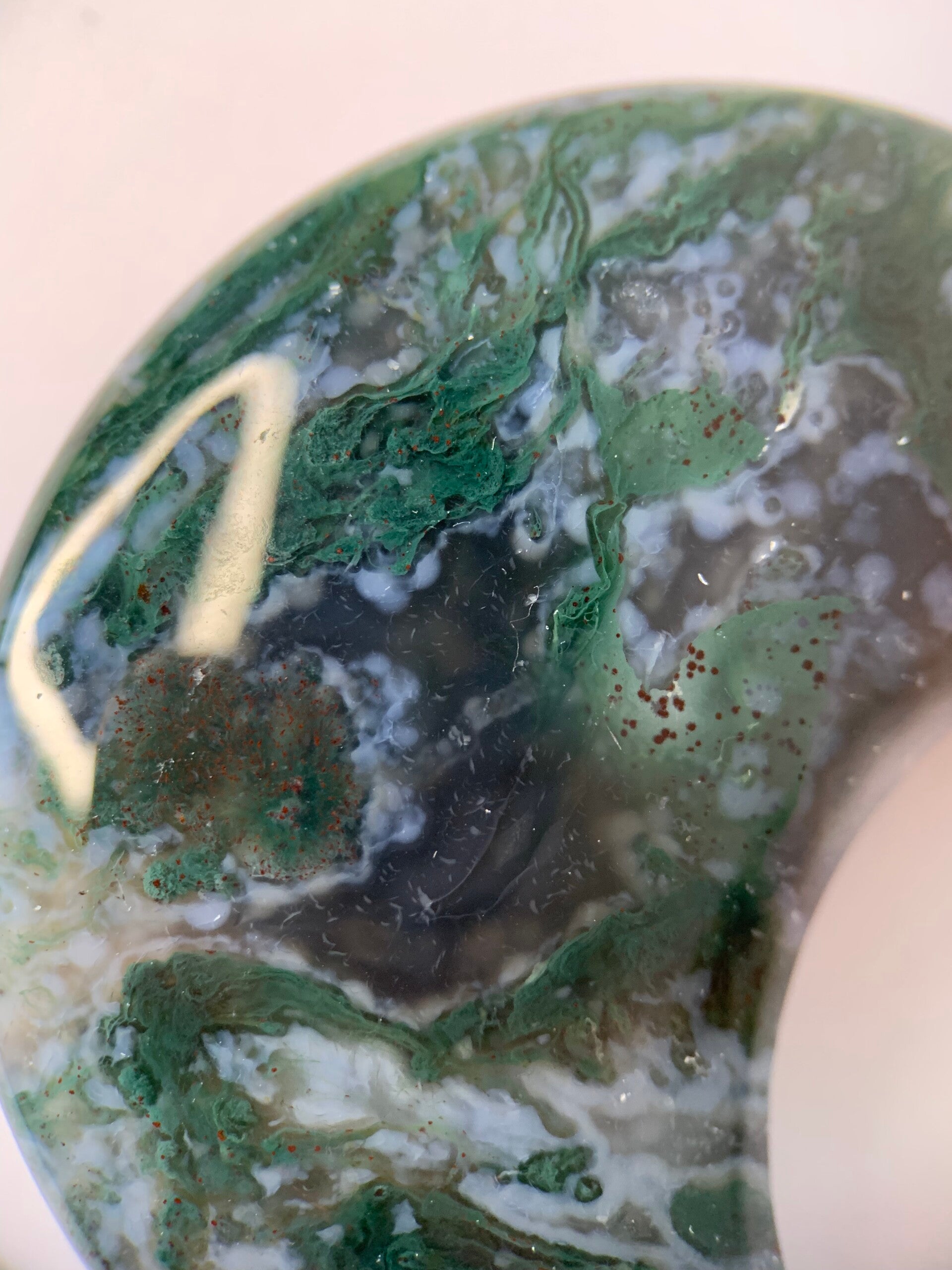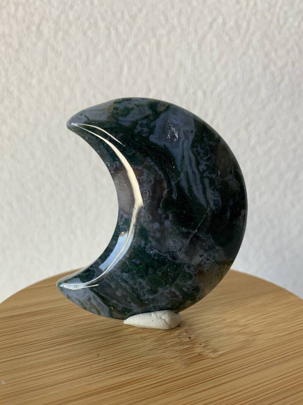 Prachtige maan van mosagaat, met donker groene en blauwe tinten. Hij heeft super mooie details! De kleur is in het echt lichter, zoals op de laatste foto.