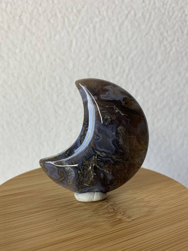 Prachtige maan van mosagaat, met bruine en blauwe tinten. Hij heeft super mooie details en zelfs druzy! De kleur is in het echt lichter, zoals op de laatste foto.