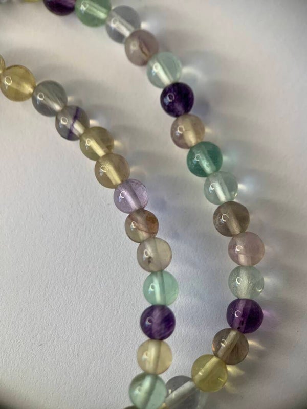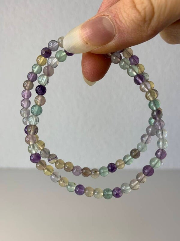 Prachtige armband van 'extra' fluoriet. Hij heeft paarse, groene, roze en gele doorzichtige kralen. De prijs is per stuk!