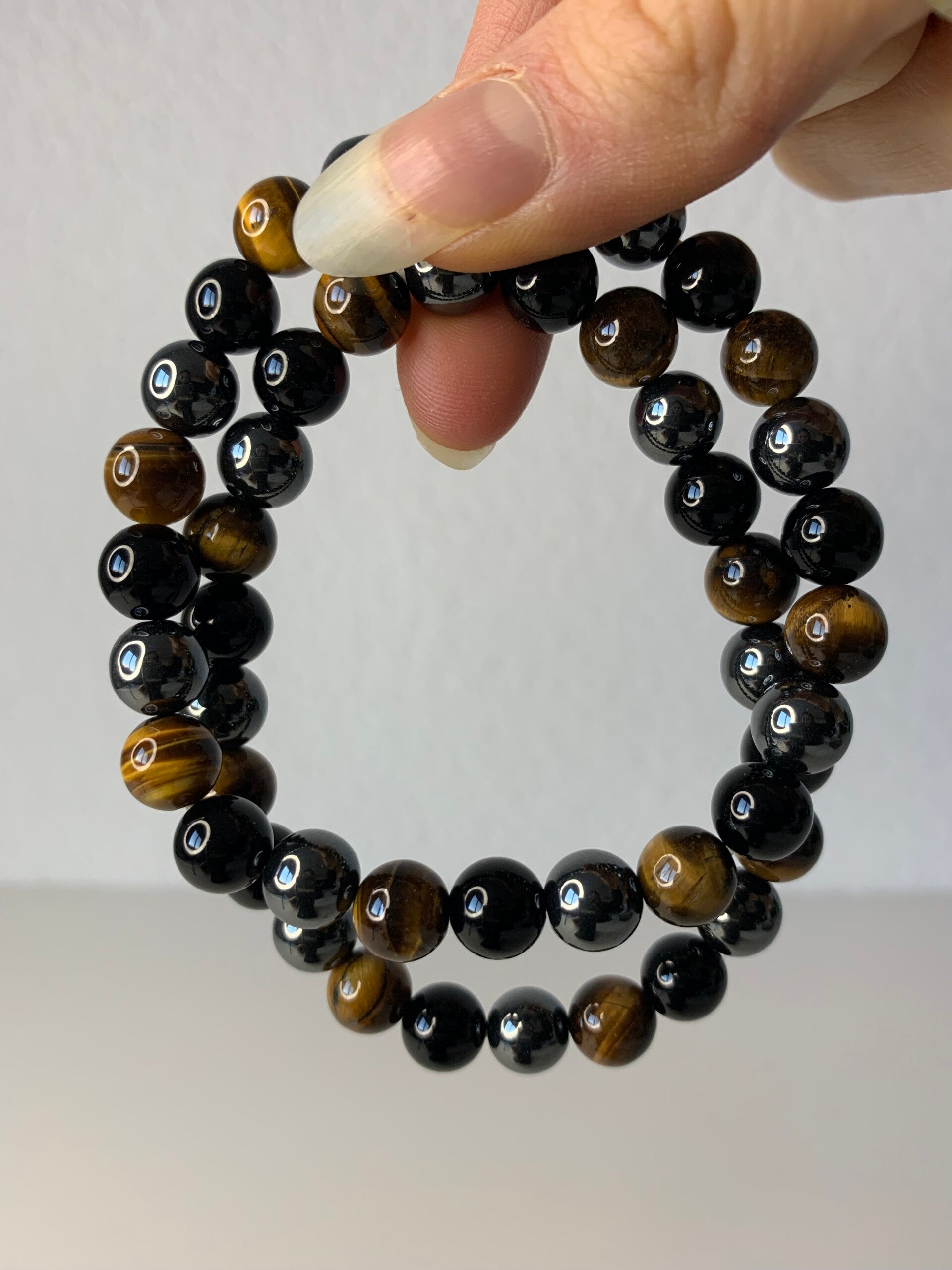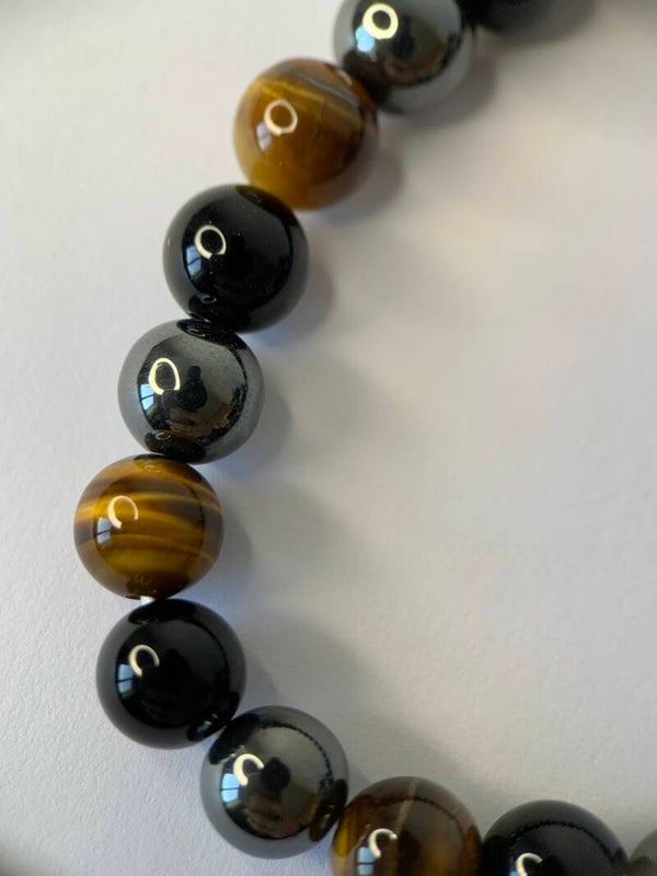 Robuste armband van hematiet, onyx en tijgeroog. De kralen zijn van hoge kwaliteit. De prijs is per stuk!