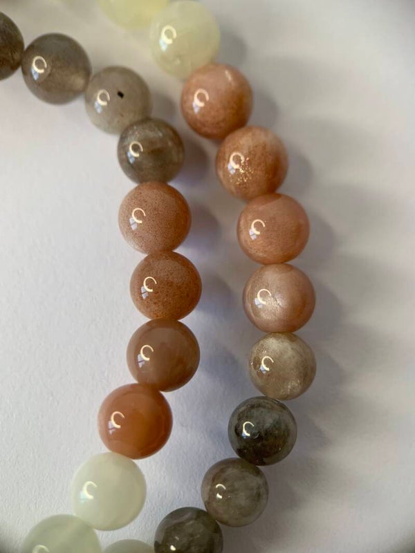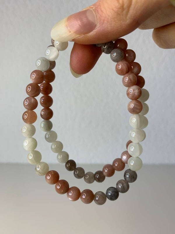Mooie armband van drie kleuren maansteen; wit, roze en grijs. Elk kraaltje heeft een prachtige flash! De prijs is per stuk.