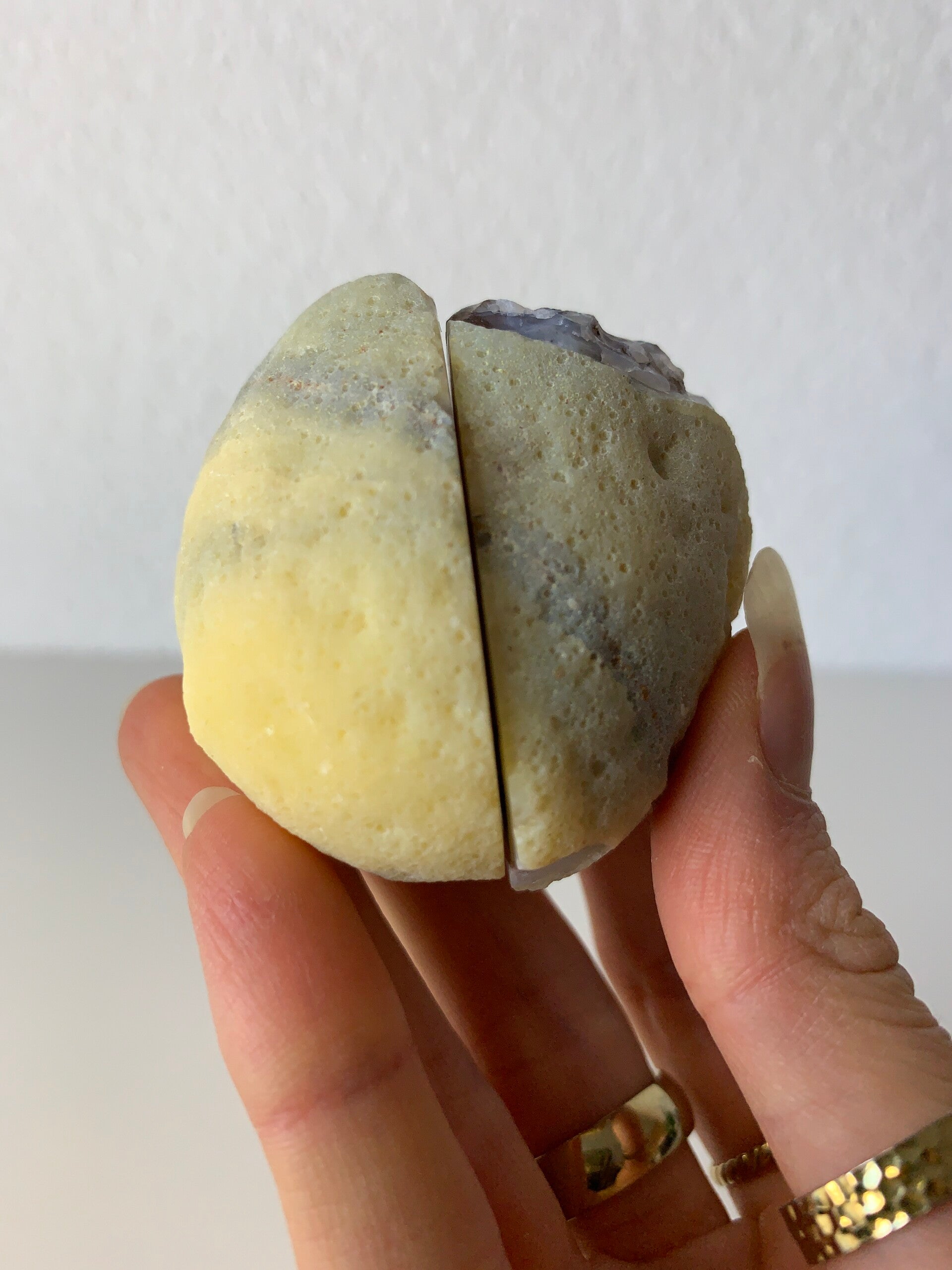 Klein geode paartje van agaat. Deze heeft een prachtige donkere rand en glinsterende druzy in het midden. Je ontvangt beide helften!