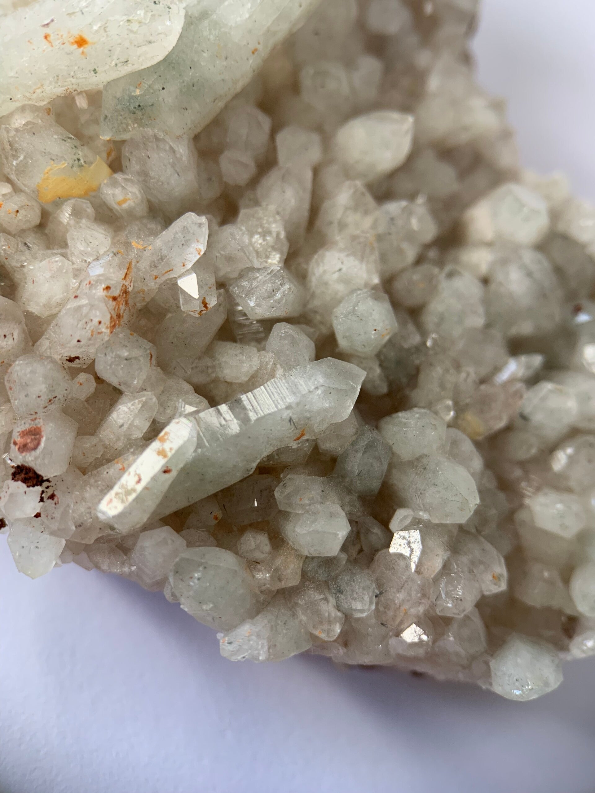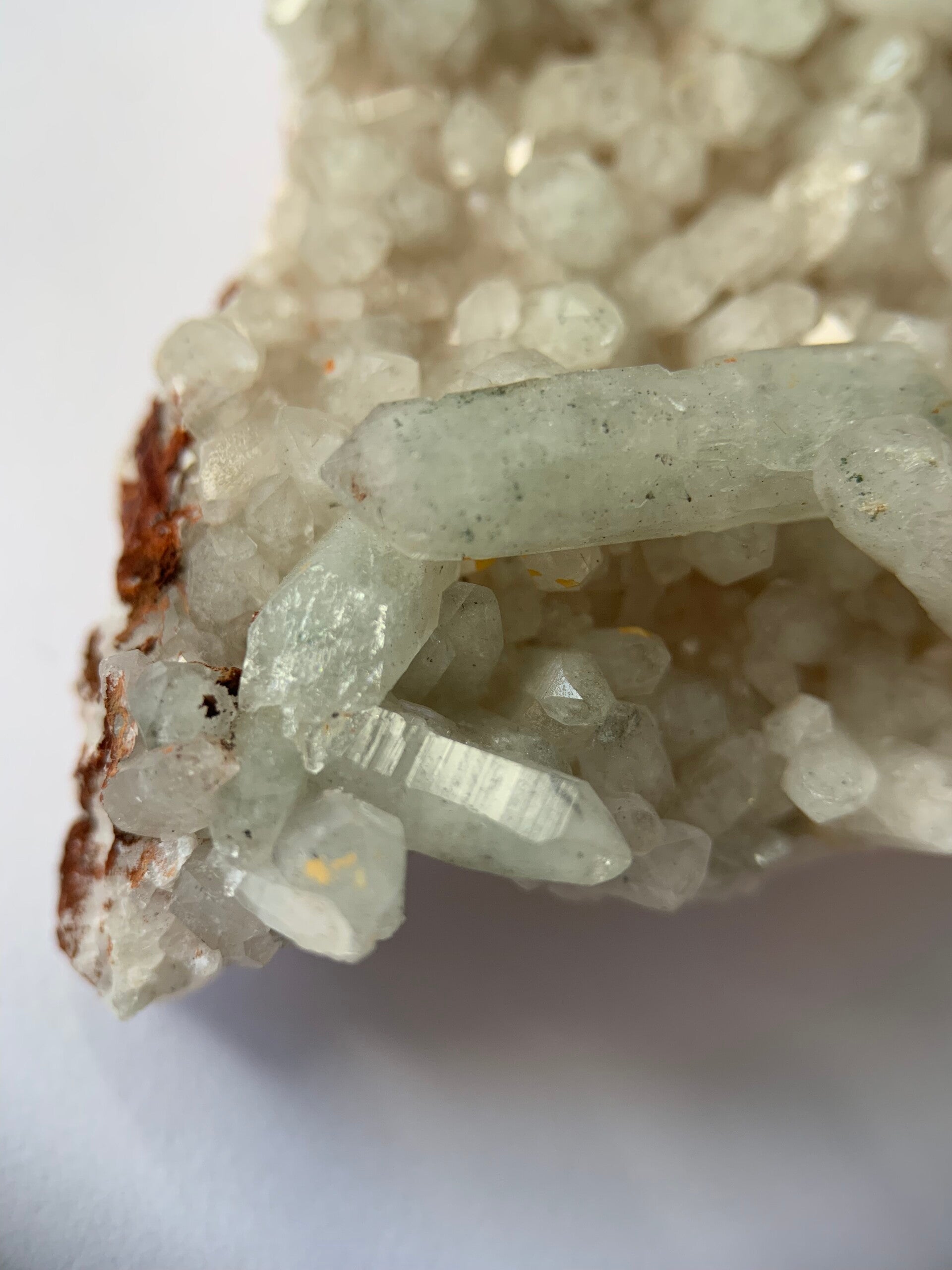 Klein dubbelzijdig clustertje van Himalaya bergkristal. De voorzijde heeft insluitsels van chloriet, de achterzijde is lichtroze kwarts.